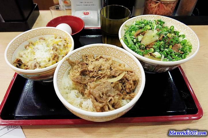 同時點了三種口味的丼飯--三種起士牛丼、牛丼、蔥溫玉牛丼