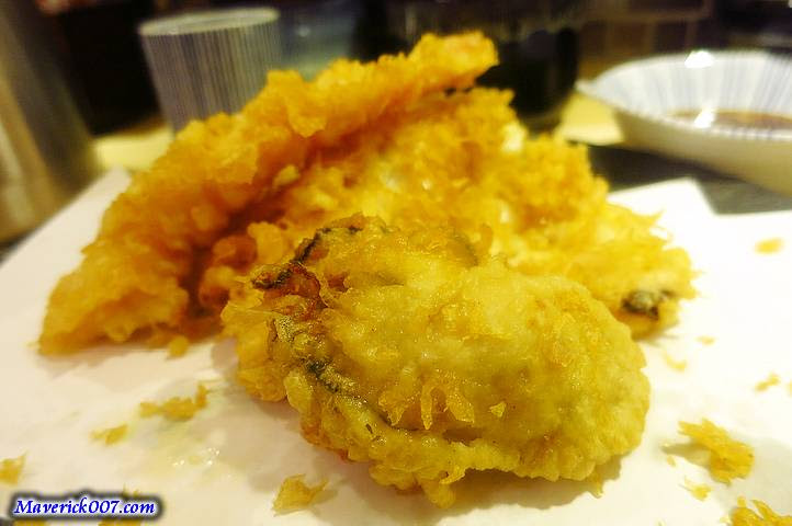 海鮮套餐炸物的內容有:秋葵、兩隻蝦、牡蠣、鱚魚、貝柱炸什錦