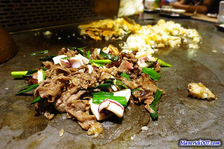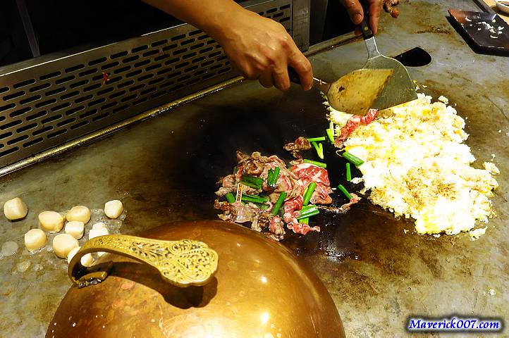 薄片的安格斯牛小排+透抽+干貝做的炒飯