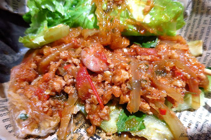 把泰式口味的醬肉包起來再夾在麵包裡